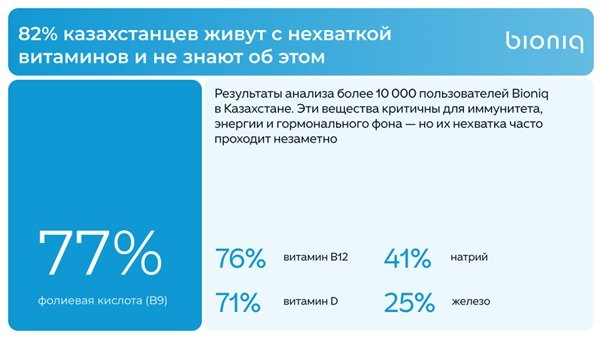 Согласно внутренней аналитике компании Bioniq, основанной на данных более 10 тысяч казахстанских пользователей сервиса индивидуальной нутриентной поддержки, 82% обследованных имеют выраженный дефицит одного или нескольких ключевых витаминов и минералов, сообщает «Спортивная орда».