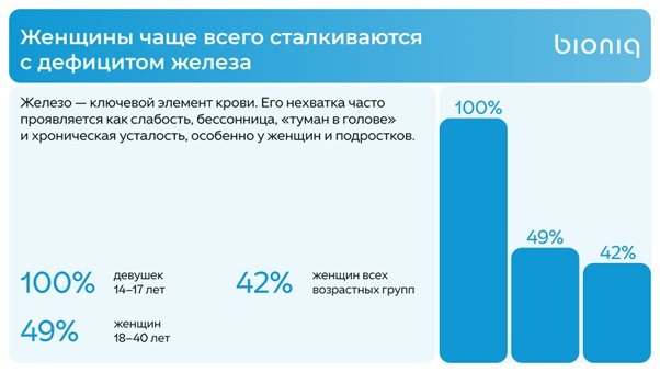 Особенно выражены дефициты у женщин: 42% обследованных имели пониженный уровень ферритина, указывающий на нехватку железа. Среди женщин 18–40 лет железодефицит был зафиксирован у 49%. В подростковой группе дефицит встречается еще чаще — у 100% девушек 14–17 лет. Для женского организма, испытывающего регулярные циклические кровопотери, периоды беременности, лактации и гормональных перестроек, железо становится критически важным маркером общего состояния. При этом симптомы часто воспринимаются как «просто усталость» и не приводят к диагностике.