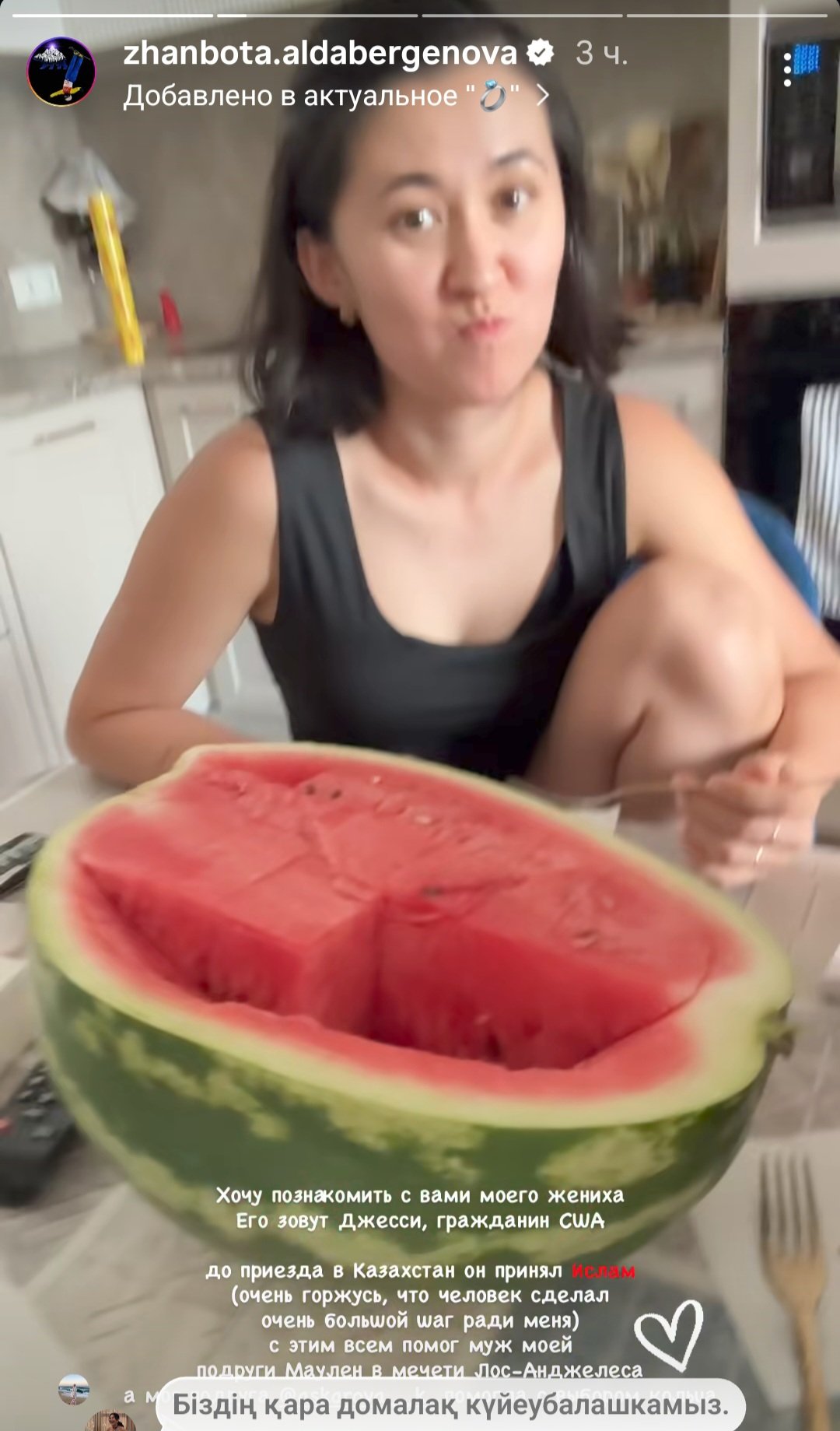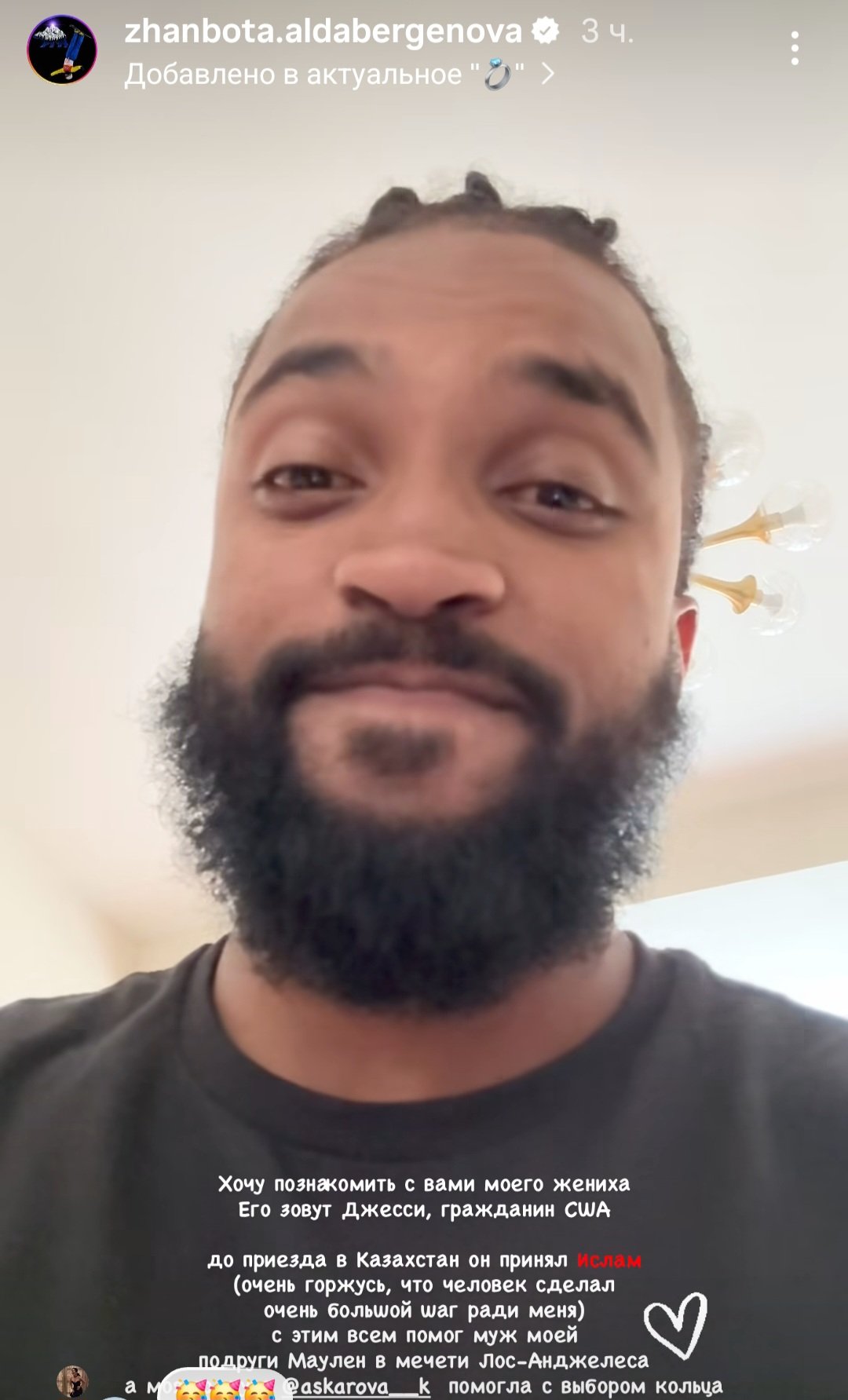 «Хочу познакомить с вами моего жениха. Его зовут Джесси, гражданин США. Познакомились мы случайно (об этом позже расскажу). До приезда в Казахстан он принял ислам (очень горжусь, что человек сделал очень большой шаг ради меня), с этим помог муж моей подруги Маулен в мечети Лос-Анджелеса», — написала 25 августа в сториз Instagram Жанбота Алдабергенова.