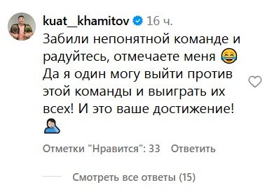 «Забили непонятной команде и радуетесь, отмечаете меня. Да я один могу выйти против этой команды и выиграть их всех! И это ваше достижение!»,написал он в Instagram kzsports.