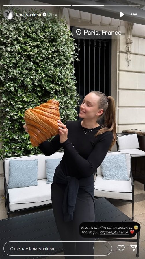 Чемпионка Уимблдона-2022 и 11-я ракетка мира Елена Рыбакина опубликовала в социальных сетях фото из Парижа после завершения выступления на «Ролан Гаррос»-2025. Казахстанская теннисистка показала подписчикам, как проводит время в столице Франции, отметив, что выбрала для себя «лучшее лакомство после турнира» — огромный круассан.