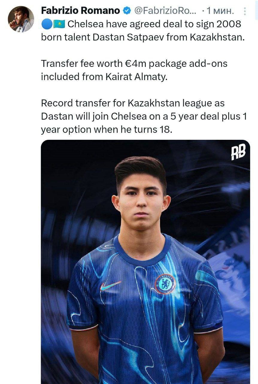 "Челси" договорился о подписании казахстанского таланта Дастана Сатпаева 2008 года рождения. Трансферная сумма составит 4 миллионов евро и включает бонусы для "Кайрата". Рекордный трансфер для казахстанской лиги. Дастан присоединится к "Челси" по достижению 18 лет на пятилетний контракт с опцией продления на год", - написал Романо в своем Х (ранее Twitter).