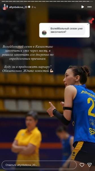 "Волейбольный сезон в Казахстане закончится через месяц. Я решила его закончить по определенным причинам. Буду ли я продолжать карьеру? Обязательно! Ждите новостей", - заявила волейболистка.