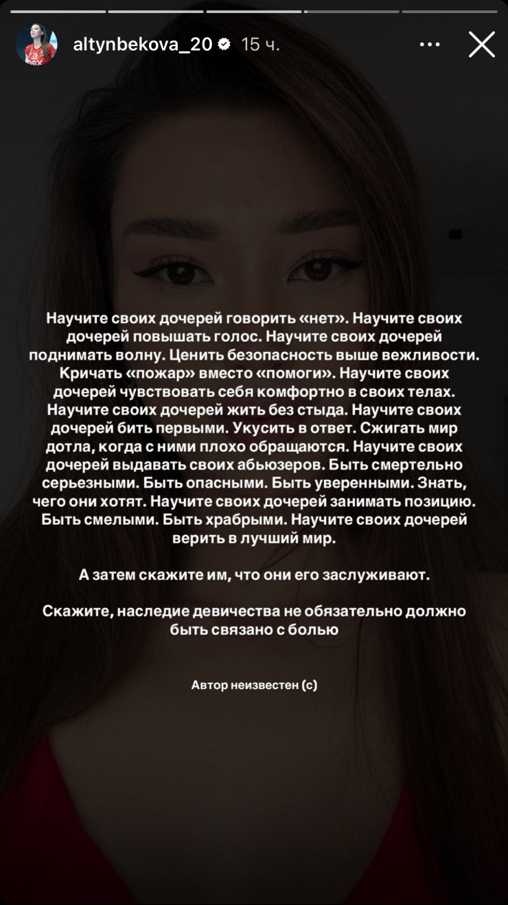 Алтынбекова заявила, что девушки, попавшие в абьюзивные отношения, должны «выдавать своих абьюзеров», а также «сжигать мир дотла, когда с ними плохо обращаются». Таким навыкам, по мнению Сабины, девушек должны обучать родители.