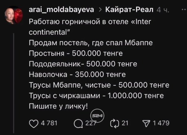 В соцсети появилось объявление от женщины, которая утверждает, что она горничная в отеле, где жил «Реал» в Алматы. Она пишет, что имеет возможность и желание продать постельное белье, на котором спал француз Килиан Мбаппе, простыню, наволочку и трусы футболиста чистые и с «чиркашами».